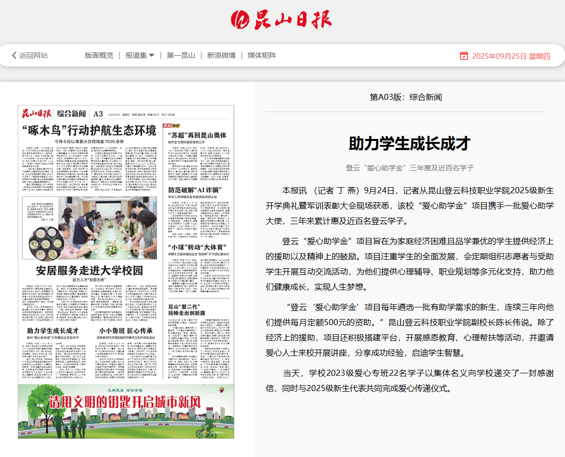 昆山日报报道我校“爱心助学金”项目助力学生成长成才